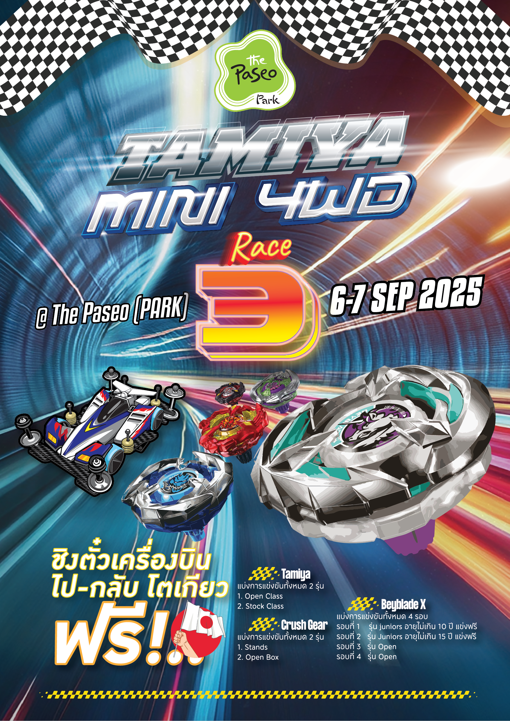 🗓️ 6-7 กันยายน 2568📍 The Paseo Park กาญจนาภิเษก 🗓️ วันเสาร์ที่ 6 กันยายน 2568Bey Blade1.รอบ Junior 2 รอบ (สมัครฟรีด้วยตนเองที่หน้างาน)-รอบ Junior อายุไม่เกิน 10 ปี ลงทะเบียน 11:00-11:50 น. เริ่มแข่ง 12.00 น.-รอบ Junior อายุไม่เกิน 15 ปี ลงทะเบียน 11:00-12:50 น. เริ่มแข่ง 13.00 น.2.รอบ Open เริ่ม...