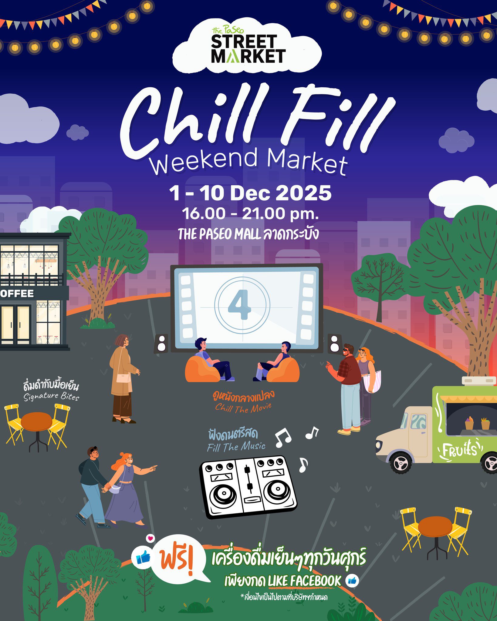 กับงาน CHILL FILL WEEKEND MARKET ที่ The Paseo Street Market ตลาดที่จะมาเติมความชิลล์ ในบรรยากาศสบาย ๆ ไฮไลต์กิจกรรม Chill Fill Signature Bites: ฟินกับ Food Truck และอาหารหลากสไตล์ ทั้งอาหารไทย, ฟิวชั่น, เบอร์เกอร์, vegan, และของหวาน Fill The Music: ฟังดนตรีสดอะคูสติก/โฟล์ก ฟังง่าย ...