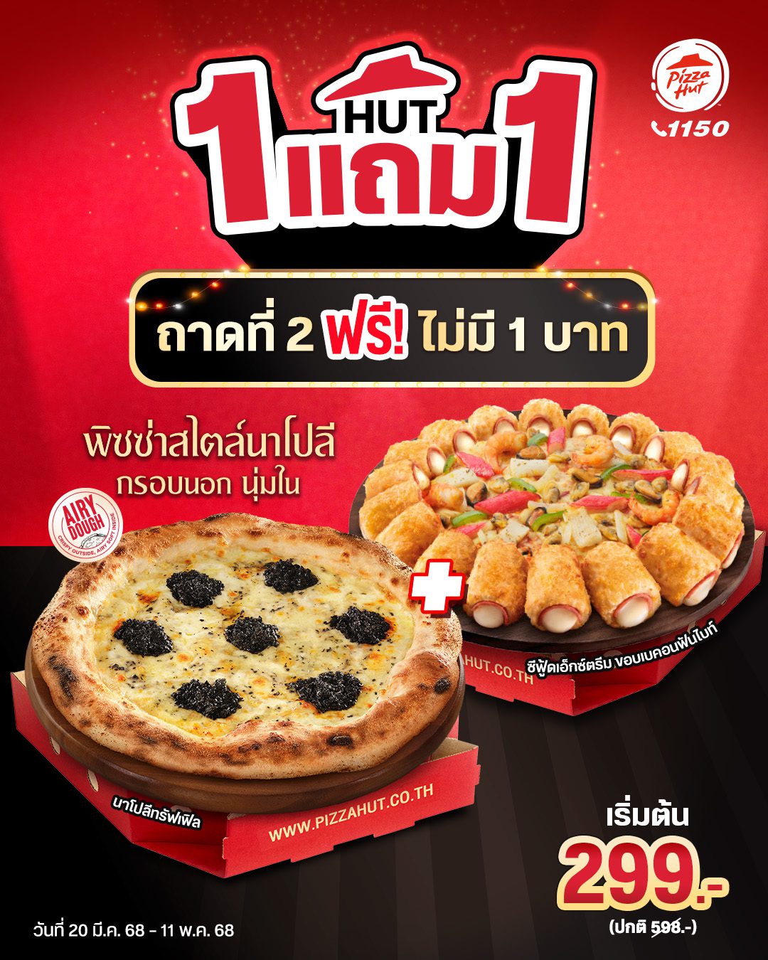– เมื่อซื้อพิซซ่าถาดแรก พิซซ่านาโปลี, พิซซ่ากุ้งกรอบไททัน หรือพิซซ่าหมวดซีฟู้ด, ดีลักซ์, สุพรีม หรือเลิฟเวอร์ หน้าใด ขอบใดก็ได้ แถมฟรี! พิซซ่าถาดที่สองในราคาที่เท่ากันหรือต่ำกว่า